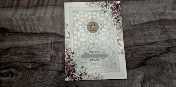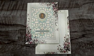 Image shows a pair of elegant, ornate wedding invitations featuring floral designs, intricate latticework, and a gold Ganesh figurine.