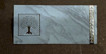 The image depicts a white rectangular object featuring a tree design.