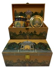The setting is indoors, with the box and jars serving as containers for items or gifts.