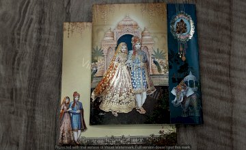 The image features a couple of pictures displayed on a table, along with a wedding card. The setting includes elements related to art and visual aesthetics, such as painting and picture frames. Clothing may also be present in the context of the wedding theme.