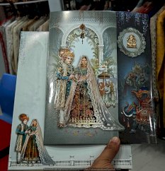 A hand is holding a wedding card. The setting appears to be indoors, and the person is dressed in clothing appropriate for a celebratory occasion. The scene emphasizes themes of love and togetherness, often associated with weddings. Tags related to the image include book, indoor, clothing, and art.