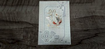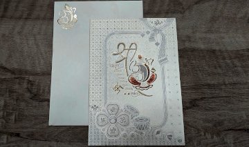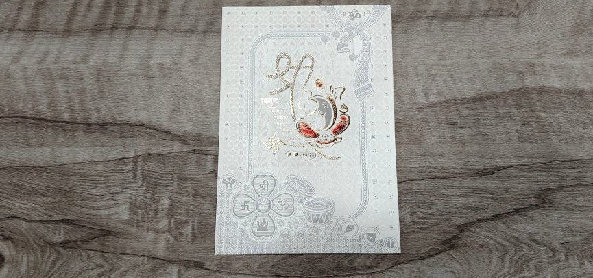 A rectangular, off-white card or invitation. A design in a light gold or metallic color is embossed or printed on it. The design includes a stylized, ornate frame enclosing a central image. The central image has stylized script or characters (likely a language other than English) and a number "63" within a flower or decorative motif. Small, ornate details, seeming to be flowers or other symbolic items, are arranged around the central design. The card has a background pattern of small, repeating shapes. A gold or metallic "Om" symbol is visible on the upper left corner of the card. The card is laid on a light gray wooden surface.