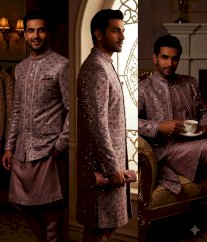 this image shows a collection of designer men's sherwani sets in soft, pastel tones, perfect for wedding or formal celebration.