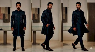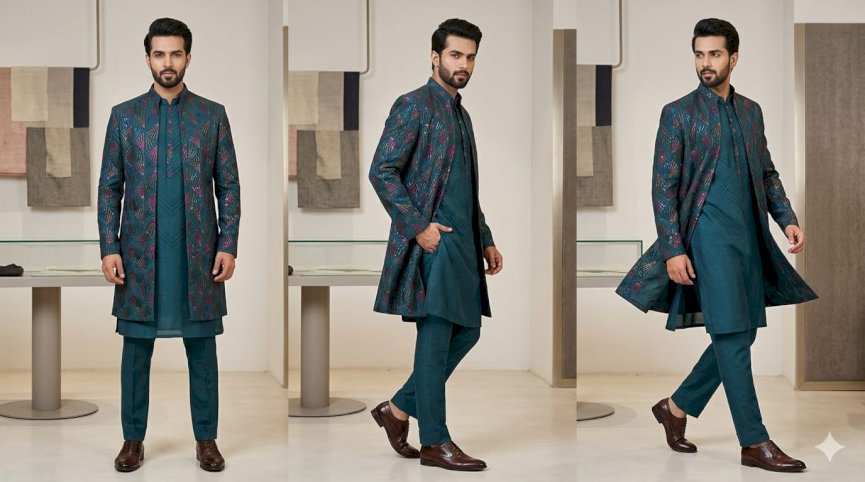the image displays a photograph of a male model wearing a teal or blue patternd kurta set with matching trousers and brown shoes, the model.