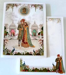 This luxurious Indian wedding invitation card features a regal illustration of a traditionally dressed bride and groom, standing gracefully amidst an opulent palace backdrop. The artwork is richly detailed with architectural domes, floral arches, and ceremonial elephants, evoking a royal and festive ambiance.