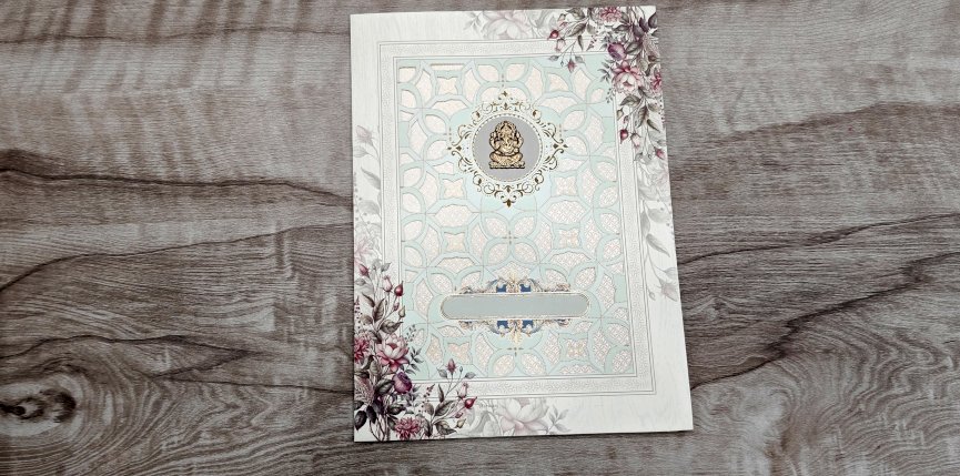 Image shows a pair of elegant, ornate wedding invitations featuring floral designs, intricate latticework, and a gold Ganesh figurine.