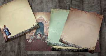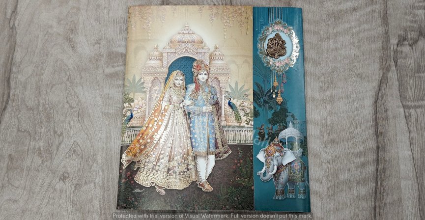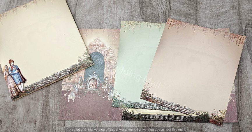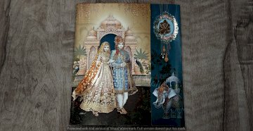 The image features a couple of pictures displayed on a table, along with a wedding card. The setting includes elements related to art and visual aesthetics, such as painting and picture frames. Clothing may also be present in the context of the wedding theme.