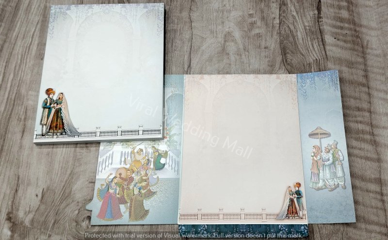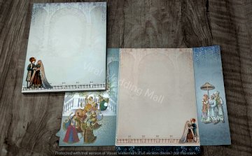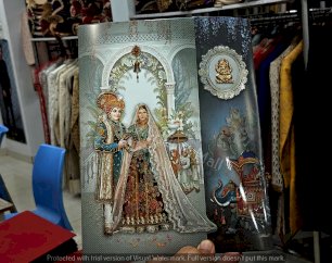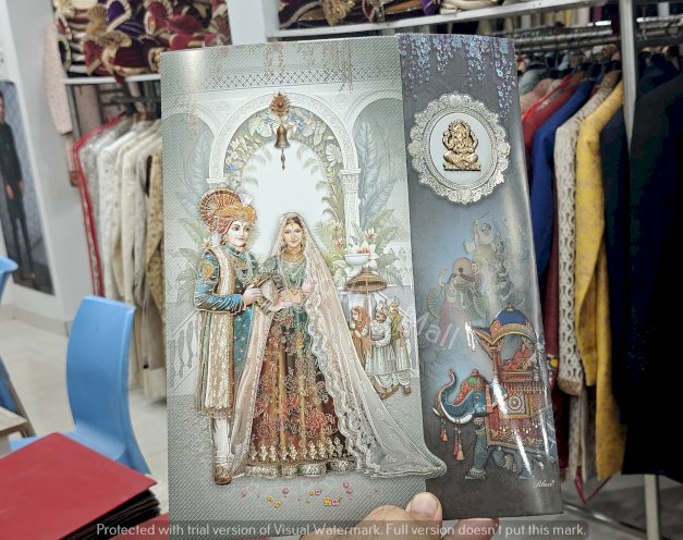 A hand is holding a wedding card. The setting appears to be indoors, and the person is dressed in clothing appropriate for a celebratory occasion. The scene emphasizes themes of love and togetherness, often associated with weddings. Tags related to the image include book, indoor, clothing, and art.