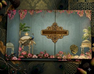 the image shows a person holding a detaild bi fold weding invitation card with a light blue background and pink floral and peacock illustrations .