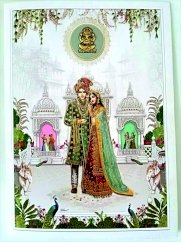 This luxurious Indian wedding invitation card features a regal illustration of a traditionally dressed bride and groom, standing gracefully amidst an opulent palace backdrop. The artwork is richly detailed with architectural domes, floral arches, and ceremonial elephants, evoking a royal and festive ambiance.