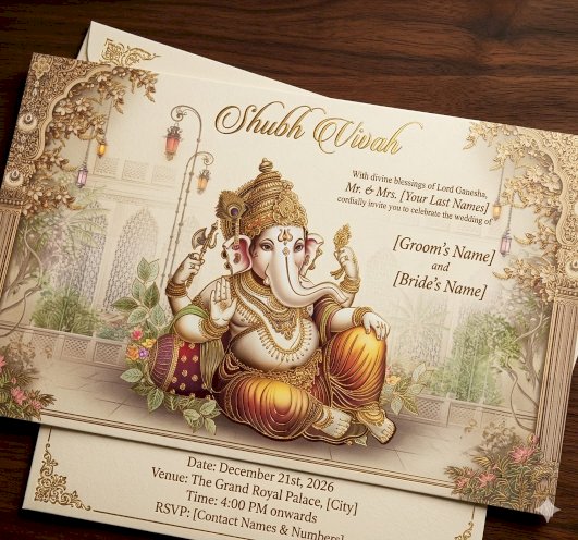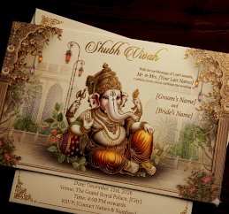 this image desplays a decorative wedding invitation card featuring a prominent, embossed illusration of the hindu deity lord ganesha.