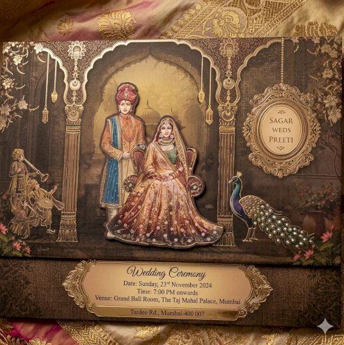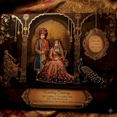 the image displays an elaborate, dark- colored indian wedding invitation card with intricate gold foil detailing.