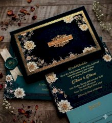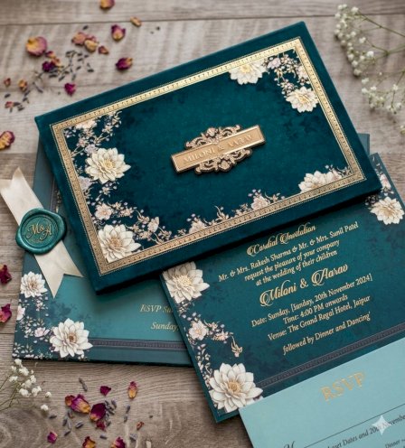 the image display an exquisite , handcrafted wedding invitation card with a dark green backgrond and a gold border.