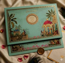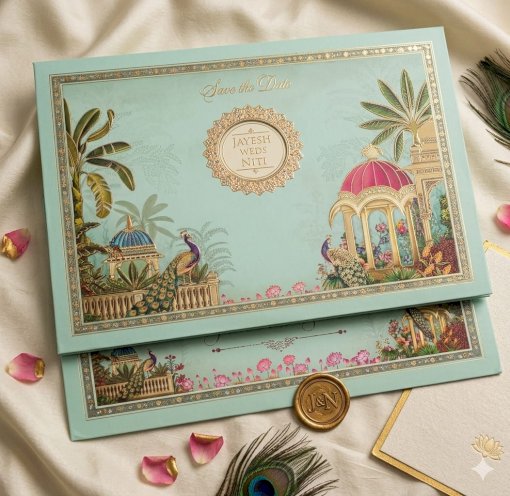 the image is a light blue or mint green wedding invitation card feuturing illustration of indian style architecure and peacocks.