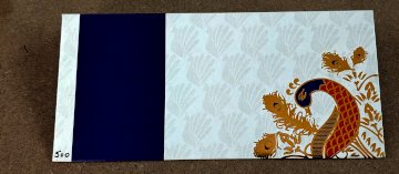 The image features a blue and white card adorned with an elegant gold design. It is designed to showcase artistic creativity, aligning with themes of child art and illustration. This card could serve as stationary or an envelope for various occasions, capturing a playful and artistic essence.